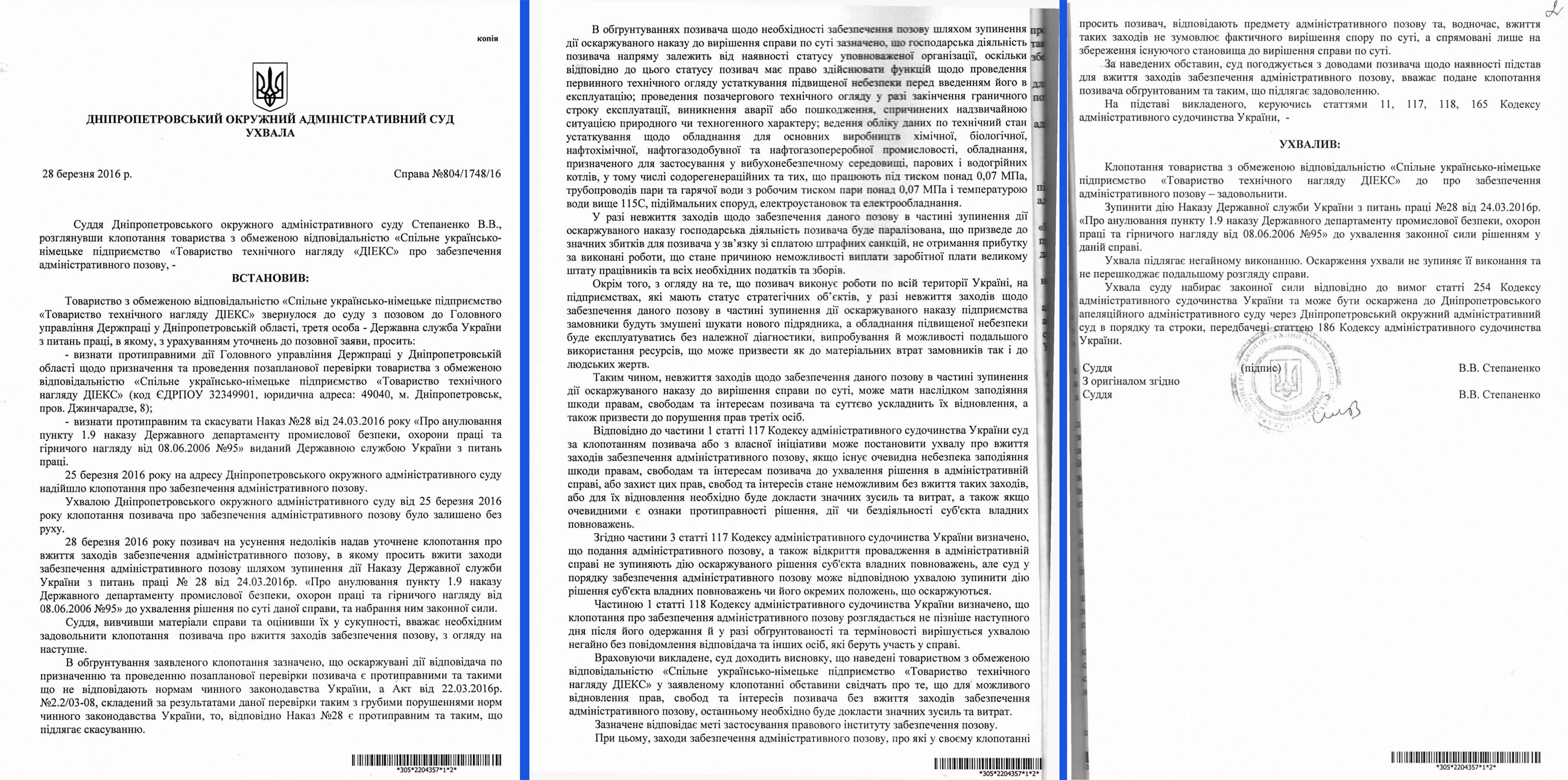 Доводимо до Вашого відома, що дії Головного управління Державної праці у Дніпропетровській області та Наказ Державної служби України з питань праці №28 від 24.03.2016р. оскаржується Товариством з обмеженою відповідальністю «Спільне українсько-німецьке підприємство «Товариство технічного нагляду ДІЕКС» в порядку адміністративного судочинства.